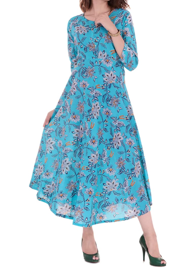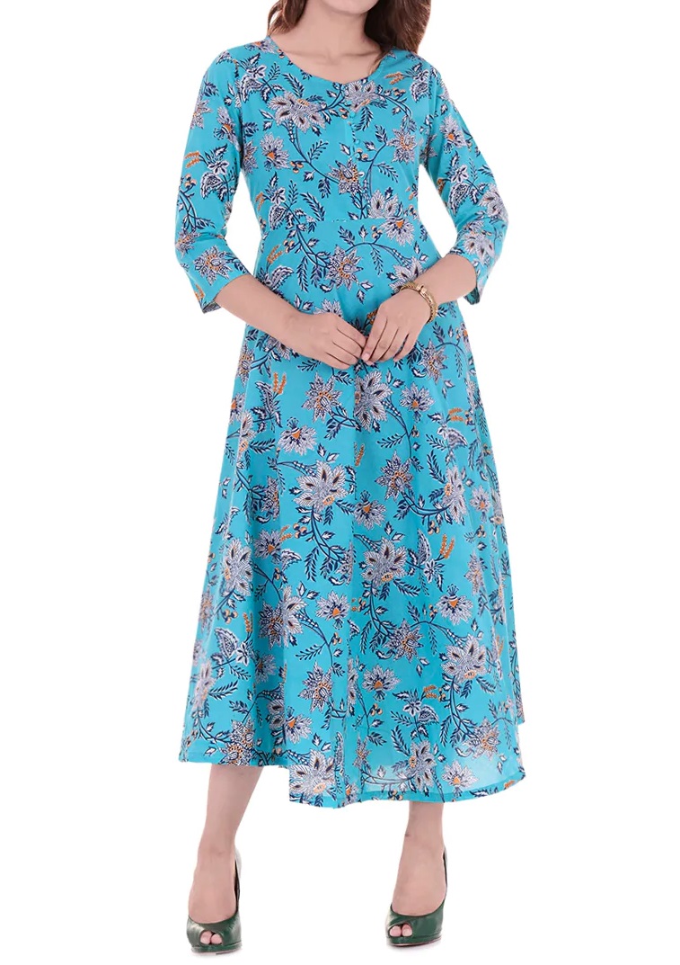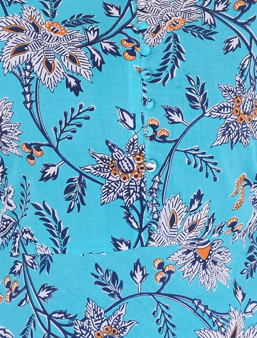 Exquisite long slim fit kurta in finest cotton with unique flared round neck placket with three quarter sleeves hand block printed pleat detailing is a great option for all those Sunday brunches and easy dinners. Pair it with a well fitted pants or churidar for the best look.